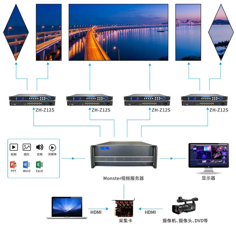 成人导航 ZH-Z800视频服务器是成人导航 为满足舞台、酒吧、多媒体展厅、会议室等不同应用场景LED大屏精心打造的一款集成播控服务器。最大支持4路5120x2880@60Hz超大分辨率点对点显示。可以实现功能超强的音视频播放、多场景编排功能,根据需求灵活配比,使用户管理便捷、操作简单,获得更好的应用使用效果