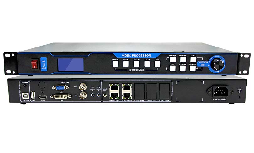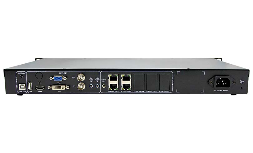 · 支持以下输出信号接口:LAN(RJ45)×4(带网口连接状态指示),整机最大支持分辨率为260万像素,支持自定义分辨率,最宽8192像素,最高2160像素;单网口宽度最大2048,高度最大1920;Audio音频(PJ35)×1;