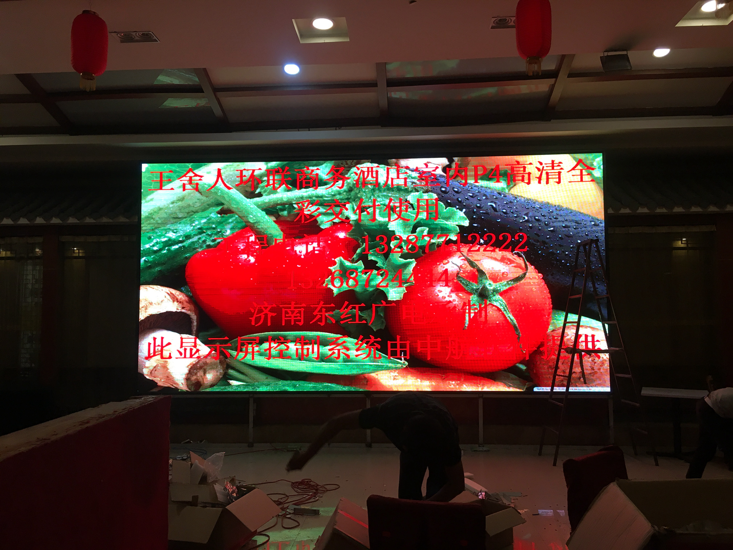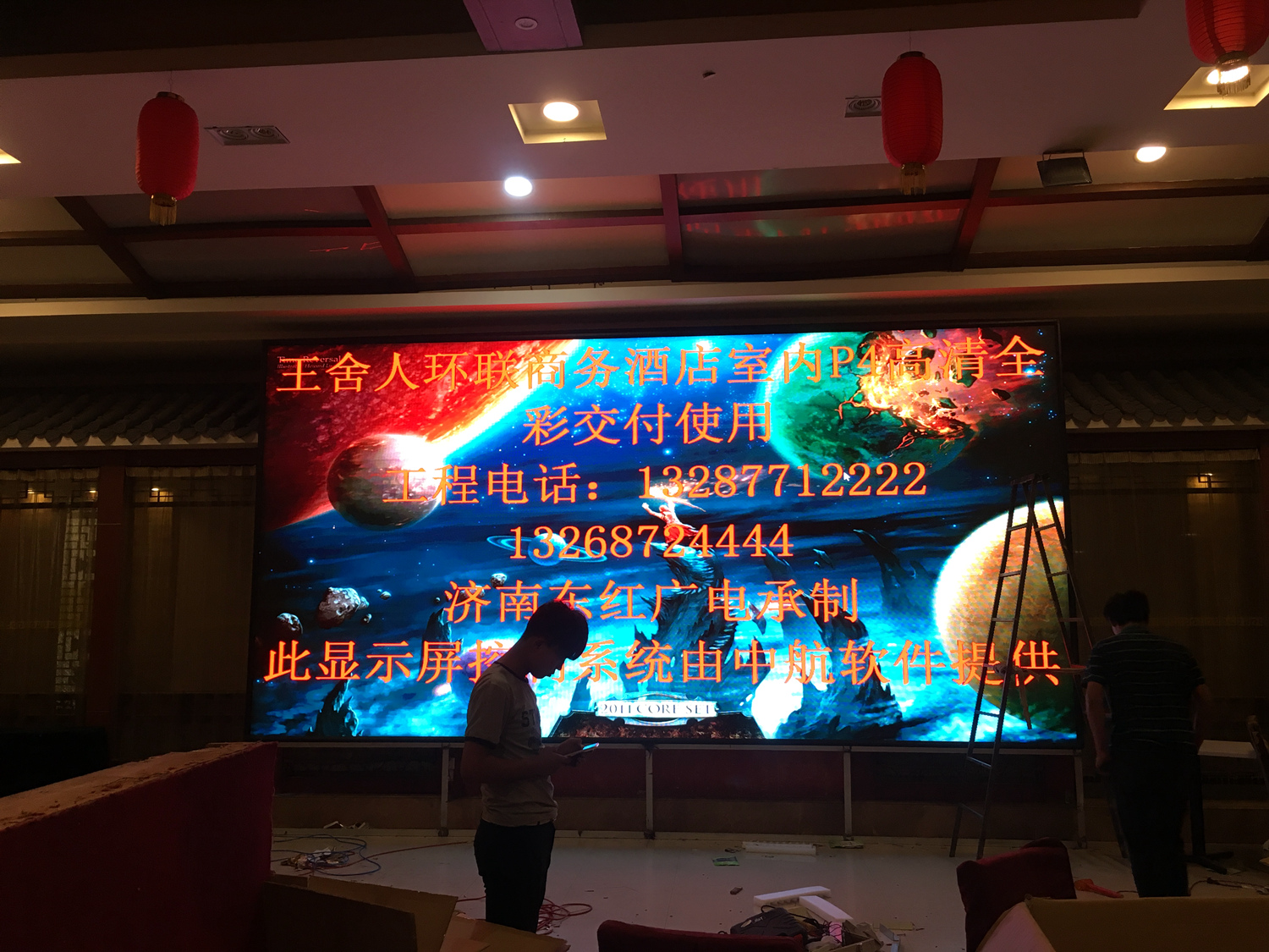 山东省济南市环联商务酒店 室内P4 ,总点数1472×736,1张发送卡,10张接收卡完美带载!单卡最大带载320×384,感谢济南东红光电徐总对成人导航 的信任和认可,我们会更加努力!