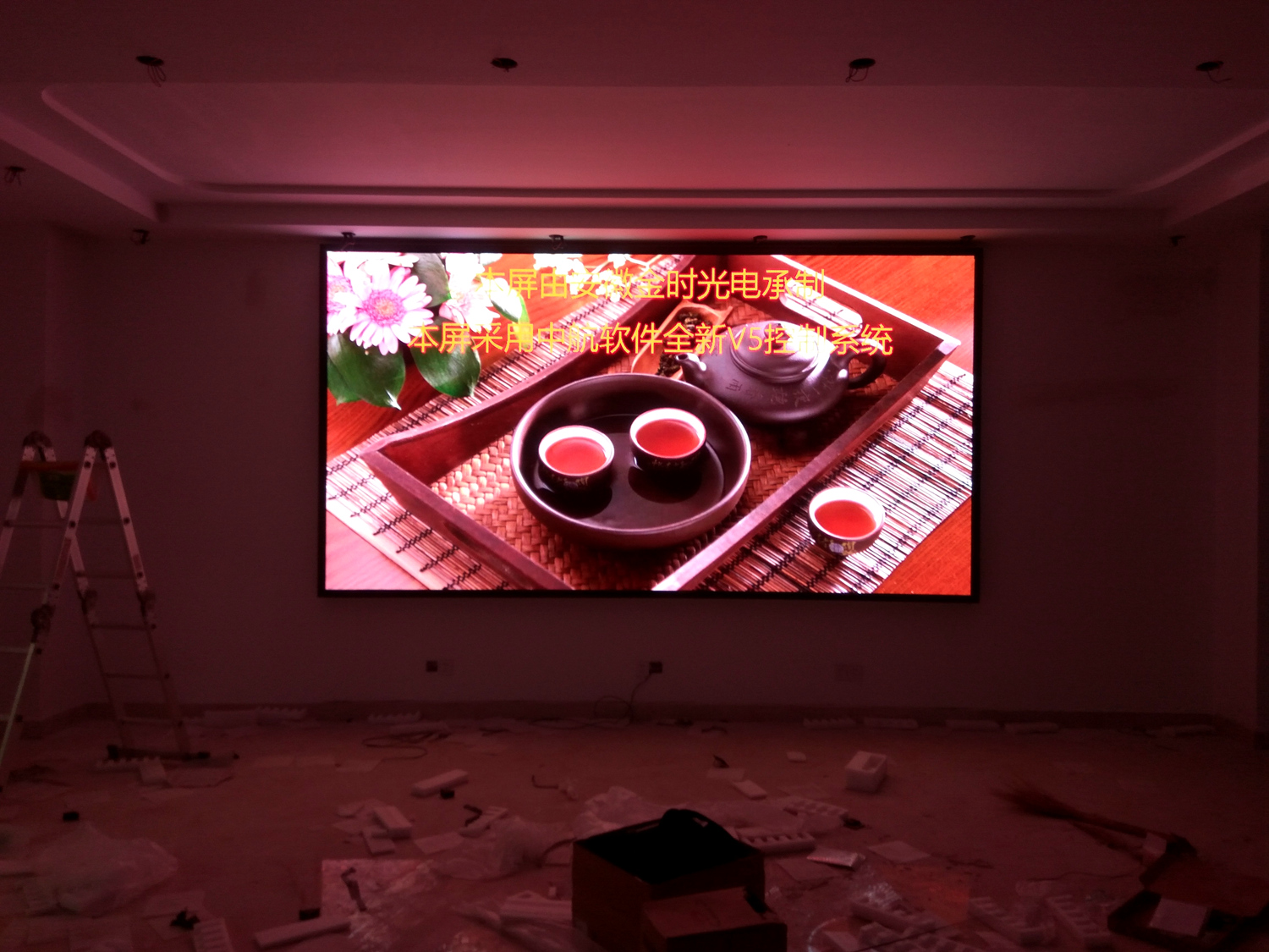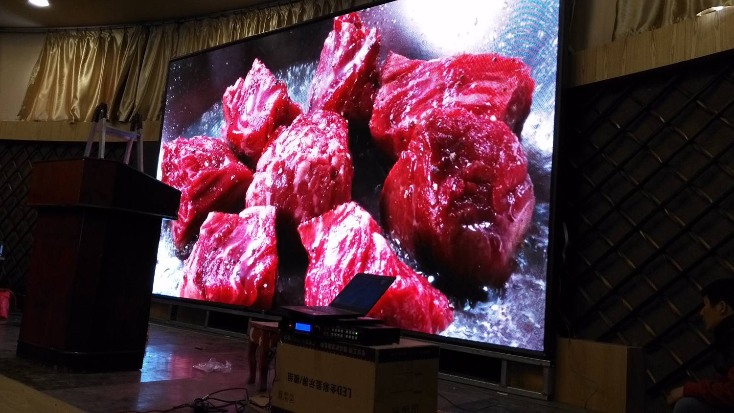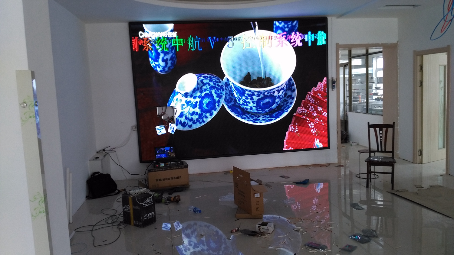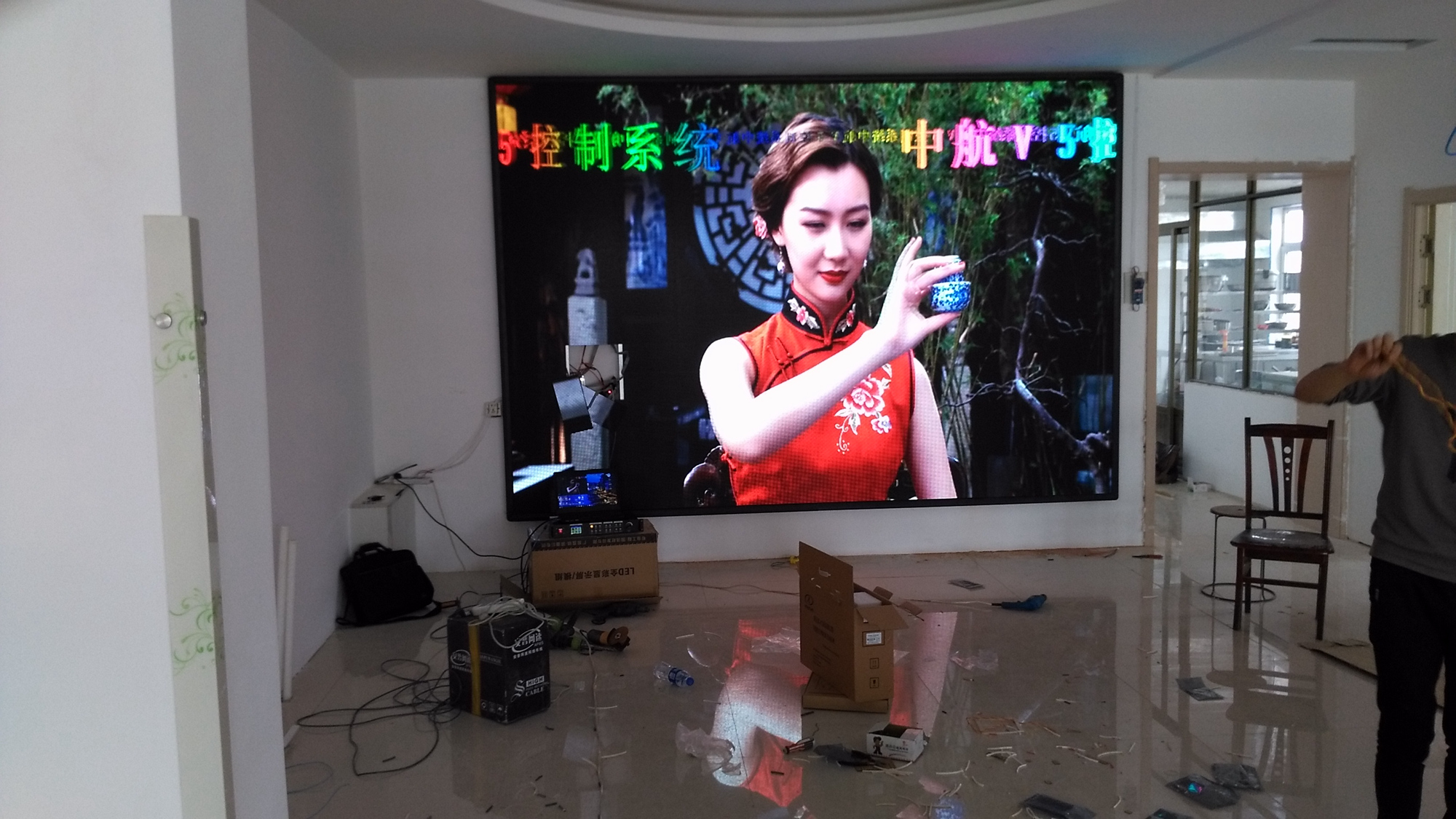 辽宁省铁岭市昌图县金家镇某饭店,户内p5单卡带载256高192宽,1张发送卡8张接收卡。成人导航 V5全彩系统,让效果证明实力!