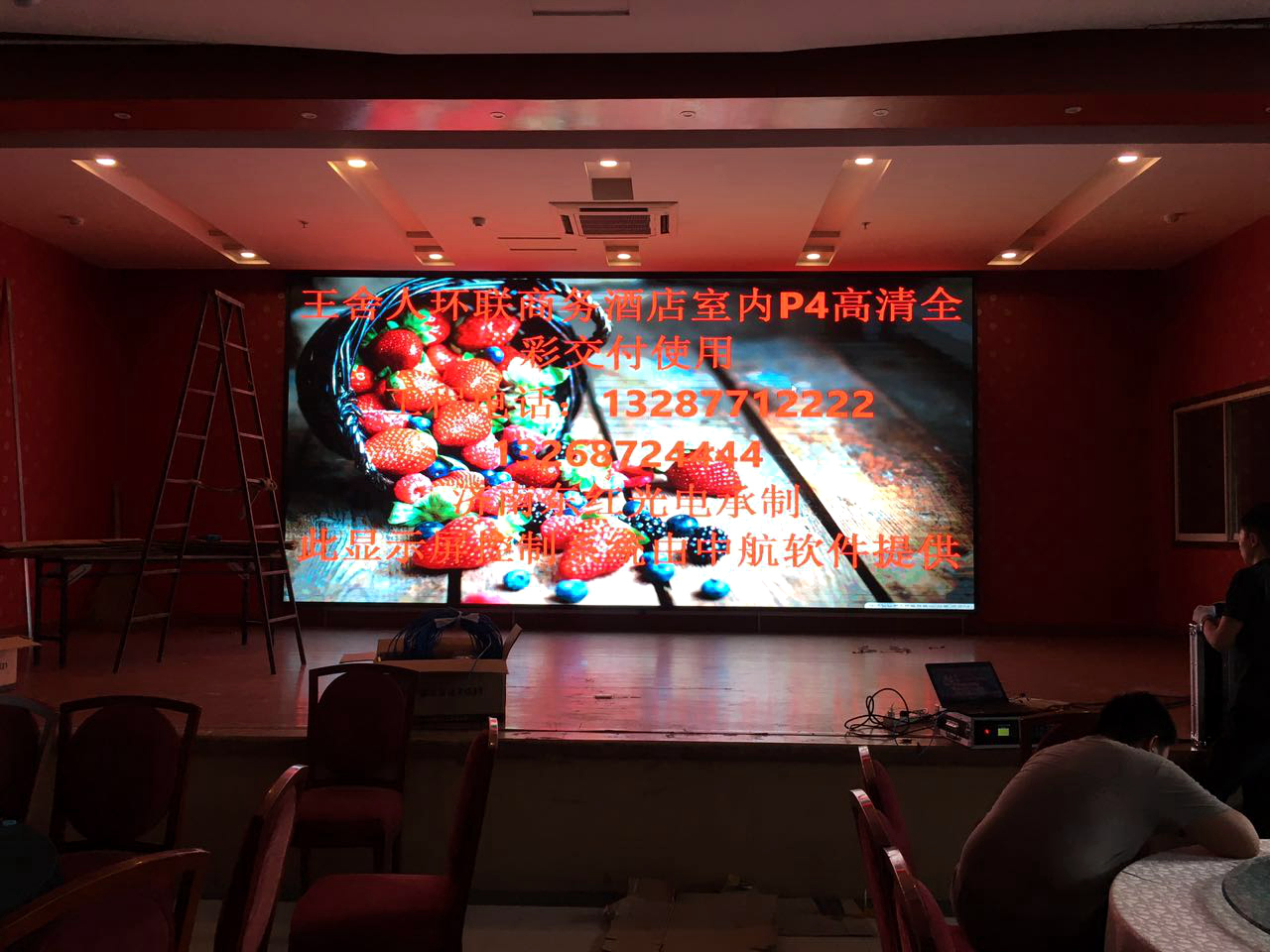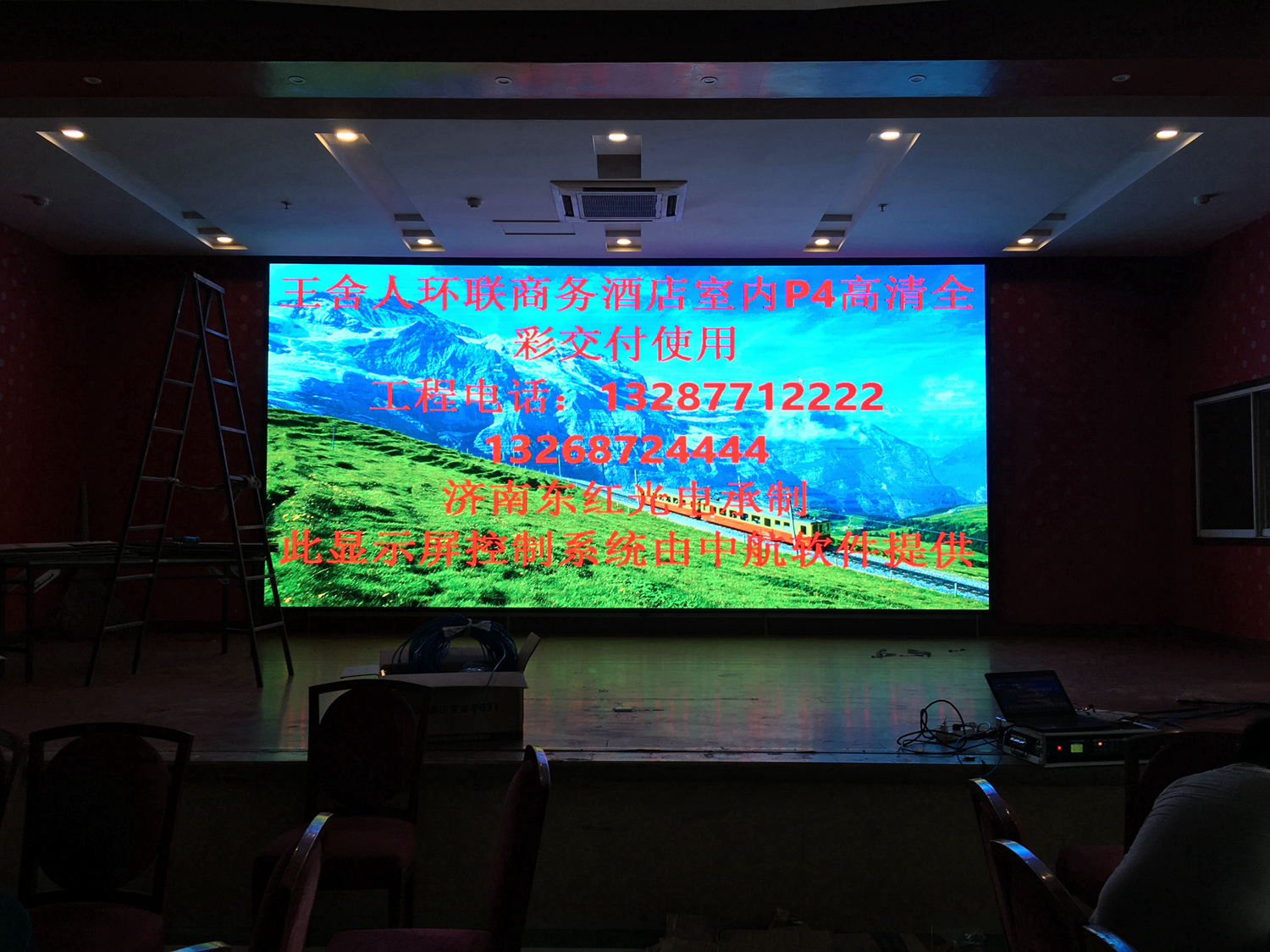 山东省济南市环联商务酒店 室内P4 ,总点数1600×768(宽×高)1张发送卡,10张接收卡完美带载!单卡最大带载320×384(宽×高),感谢济南东红光电徐总对成人导航 的信任和认可,我们会更加努力!成人导航 V5全彩系统,让效果证明实力!