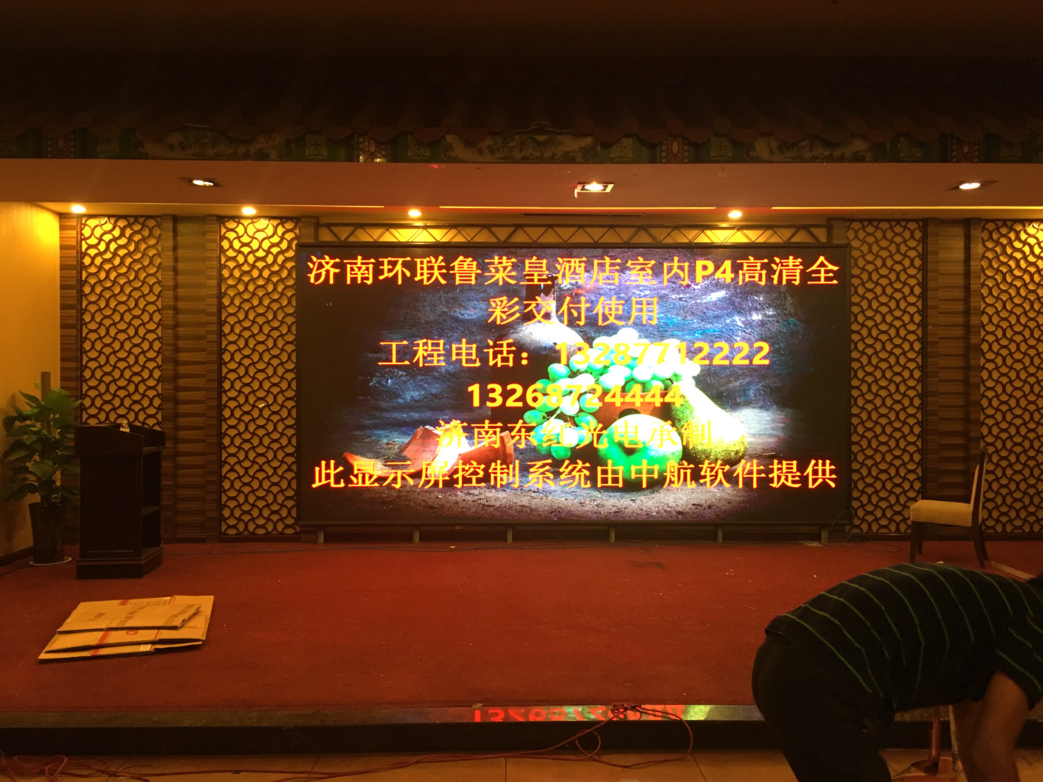 山东省济南市环联鲁菜皇商务酒店 室内P4 ,总点数1280×640(宽×高)1张发送卡,8张接收卡完美带载!单卡最大带载320×320(宽×高),感谢济南东红光电徐总对成人导航 的信任和认可,我们会更加努力!我们会努力做的更好!成人导航 V5全彩系统,让效果证明实力!