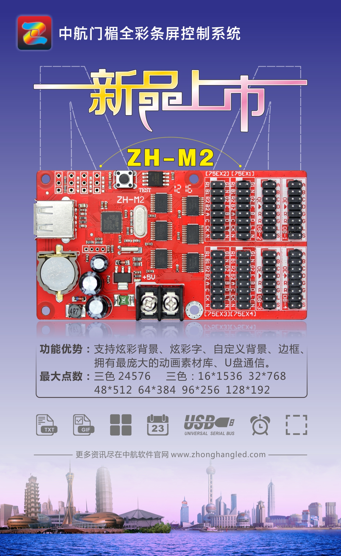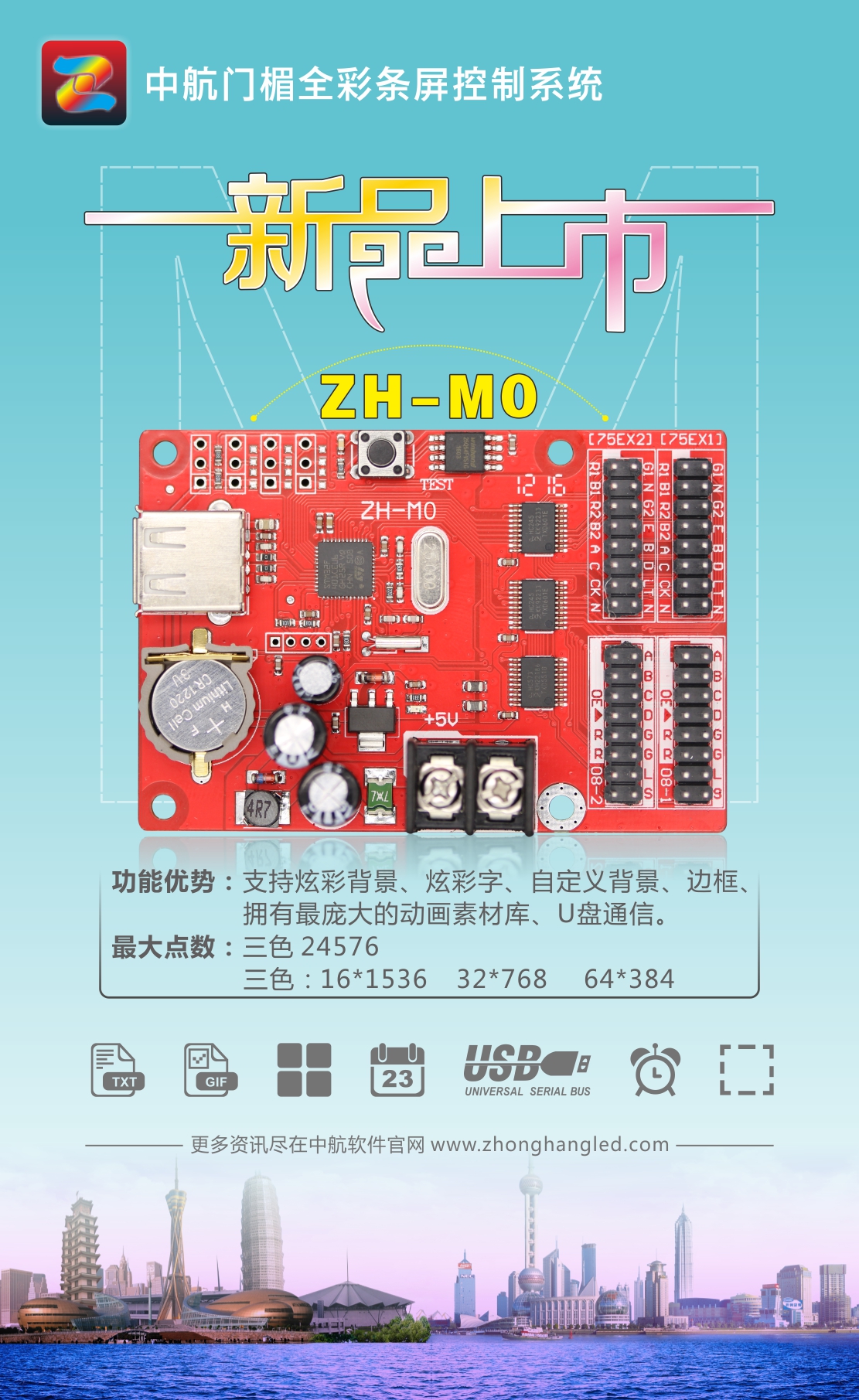 温馨提示:门楣全彩条屏控制系统需下载专用软件,请到我们官网(www.zhonghangled.com)下载中心里下载。