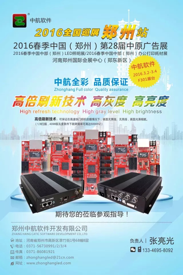 在接下来,成人导航 2016年全国巡展-郑州站展览会上,成人导航 将展示的产品系列有:全彩同步系列,全彩异步系列,门楣全彩,全面升级第六代WIFI系统,GPRS系列等。诚邀您莅临成人导航 展台,把握中部崛起的时机,乘坐中原交通网、陆上丝路,携手铸造2016年新辉煌!