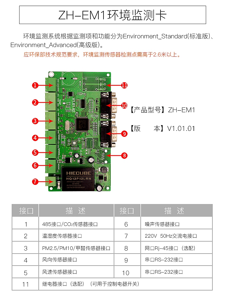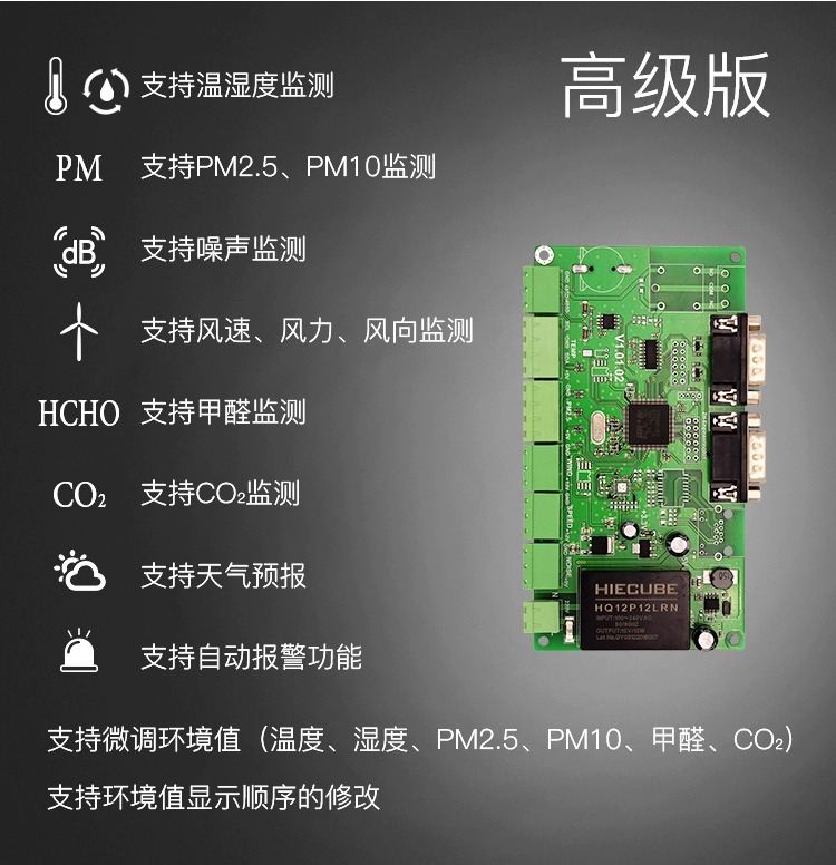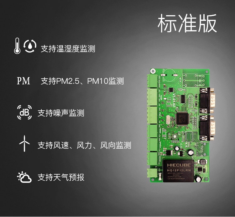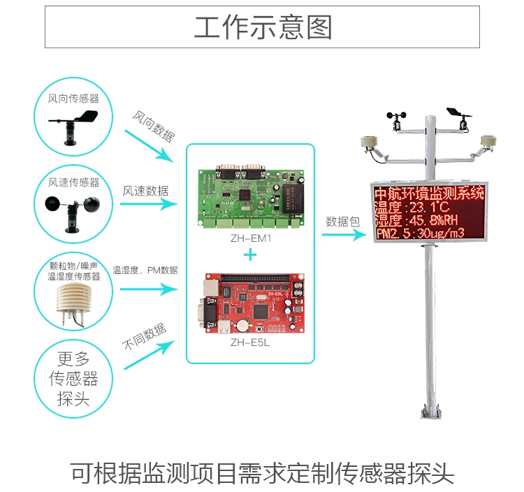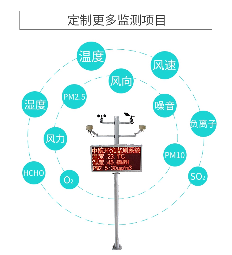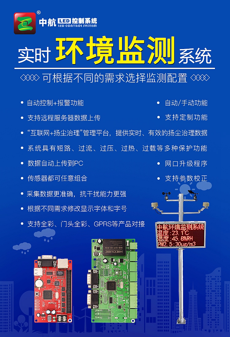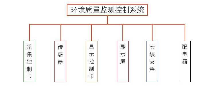 环境质量监测控制系统包括采集控制卡、传感器、显示控制卡、显示屏、安装支架、配电箱六个部分组成。