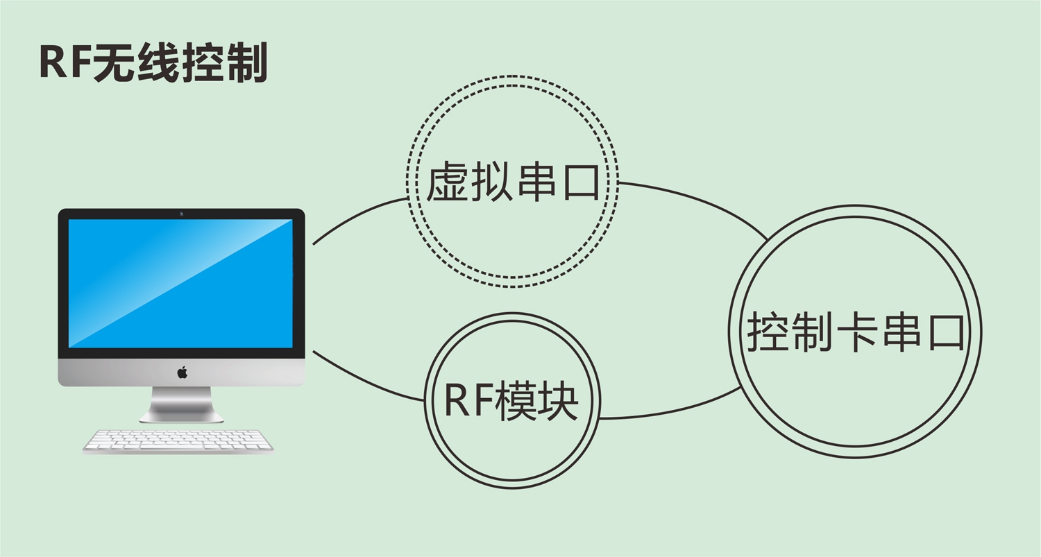 工作原理:RF模块一端接到控制电脑,另一端接到控制卡串口,电脑安装驱动程序后,产生一个虚拟串口,并通过此串口发送数据。