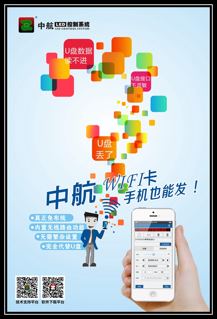 我公司推出V3版WiFi控制系统,软件操作简单好用,免布线、免U盘、无需连接宽带,更无后期任何附加费用,高质量方案,更容易被行业人员所接受使用,我们相信成人导航 无线WiFi控制系统正在创造另一个神话——无线WiFi控制卡取代U盘控制卡成为市场主流产品。