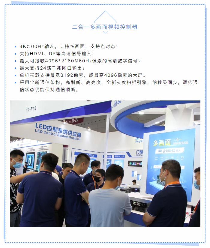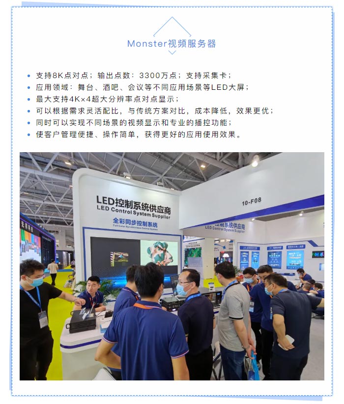 重磅推出:二合一多画面视频控制器、Monster视频服务器、二合一视频控制器、同异步三合一主控、战狼系列发送器+接收卡、工程专用异步播放系统、远程4G云发送集群系统、门楣条屏系统等一系列产品。展会期间,二合一多画面视频控制器备受热捧,现场参观宾朋纷纷体验,气氛热烈。