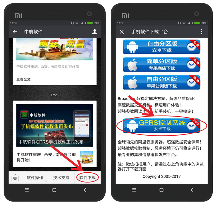 微信公众平台,点击右下角“软件下载”--点击“GPRS控制系统安卓下载”按钮。使用浏览器打开,点击下载,安装完毕即可使用。